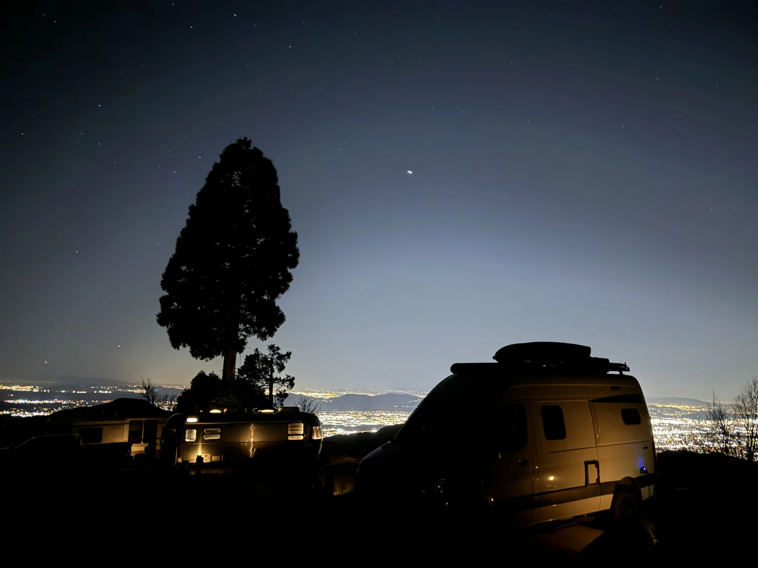 The campground is located directly across the street from Santa’s Village on HWY 18 “Rim of the World Highway.” It offers panoramic views. On a clear day, you should be able to see Catalina Island. Due to the campground’s perched location; it was incredibly windy at our campsite. With the January cold and powerful wind, we opted to eat our dinner inside the van. Not having to contend with two car seats (and two kids) makes the van dreamy. We tell everyone when they ask about how the van is: it is perfect for two adults; it gets really cozy (read: crowed) with two additional tiny humans. To be able to stretch out on the bench seat and eat at our pedestal table was a nice change.